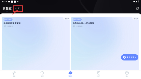 2、在冥想室頁(yè)面,點(diǎn)擊頂部社區(qū)選項(xiàng),進(jìn)入社區(qū)板塊。