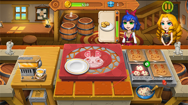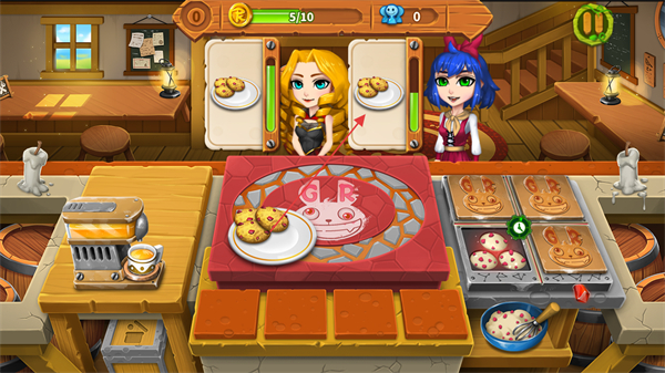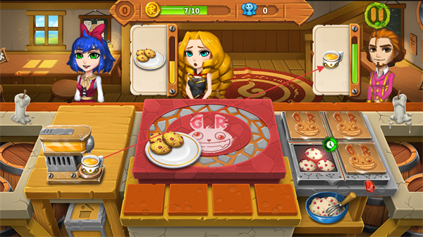 2、根據(jù)左側(cè)顧客需求,將烤好的餅干裝盤,滿足其需求獲取金幣,使金幣數(shù)量增加如$7。