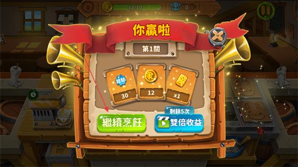 4、完成本關(guān)所有顧客訂單,出現(xiàn)你贏啦提示,領(lǐng)取經(jīng)驗(yàn)值,金幣等獎(jiǎng)勵(lì),點(diǎn)擊繼續(xù)烹飪進(jìn)入下一關(guān)。