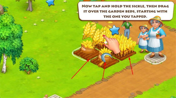 1、收割作物時(shí),按住鐮刀并拖動(dòng),從點(diǎn)擊的那塊菜園開始,劃過菜園床完成收割。