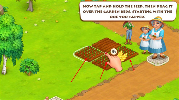 2、播種時(shí),按住種子并拖動(dòng),從點(diǎn)擊的菜園床開始,將種子播撒到菜園床里。