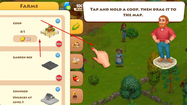 3、建造雞舍時(shí),花費(fèi)10金幣,按住雞舍并拖動(dòng)到地圖上合適位置進(jìn)行建造。
