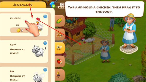 4、飼養(yǎng)動(dòng)物時(shí),比如雞,花費(fèi)5金幣,按住雞并拖動(dòng)到雞舍中,還可解鎖牛、蜜蜂等其他動(dòng)物進(jìn)行飼養(yǎng)。