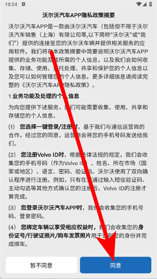1、打開沃爾沃汽車,在彈窗中點擊同意。