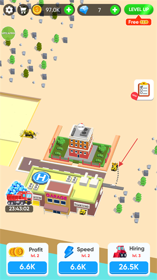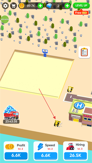 1、進入游戲,查看屏幕上方金幣數(shù)量如89.7K,點擊下方Hiring按鈕花費金幣雇傭推土機。