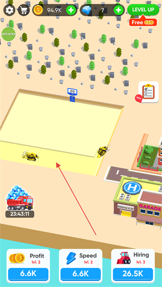 2、雇傭后,推土機開始挖掘,獲取更多金幣,留意金幣數(shù)量增長如增至94.9K。