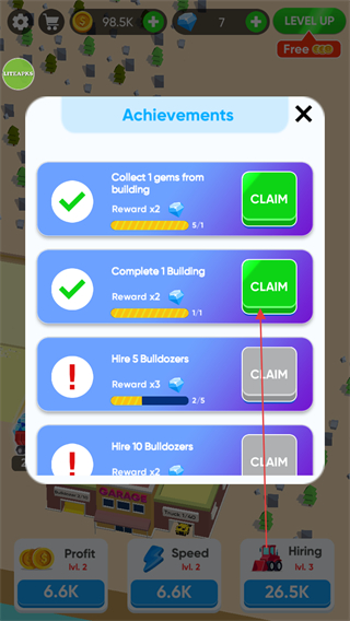 4、完成特定任務如Collect1gemsfrombuilding,點擊Achievements界面里的CLAIM領取獎勵,加速游戲發(fā)展。