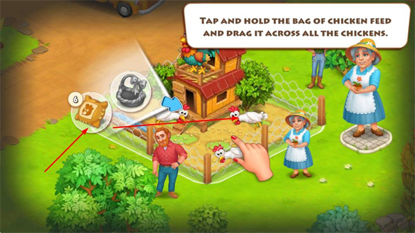 1、喂養(yǎng)雞時(shí),按住雞飼料袋并拖動(dòng),劃過(guò)所有雞,完成喂食操作。