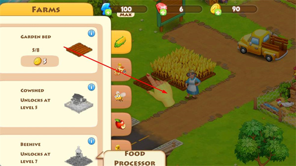 3、在農(nóng)場(chǎng)界面,可花費(fèi)5金幣建造菜園床,還能解鎖牛棚、蜂箱等設(shè)施。