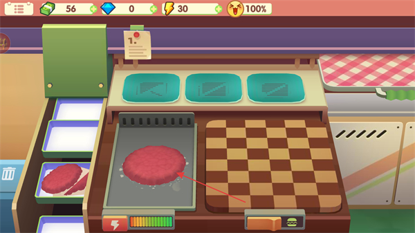 1、查看界面上方資源數(shù)值,點擊食材欄取牛肉餅,放烤架上烹飪。