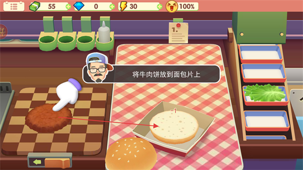2、牛肉餅烤好后,按提示將其放到面包片上。
