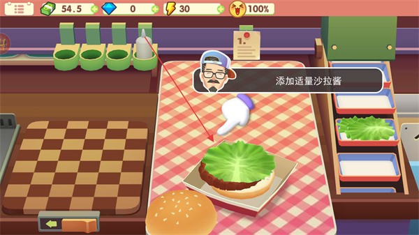 3、從食材欄選取生菜放在牛肉餅上,再添加適量沙拉醬。