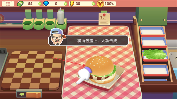 4、最后將另一片面包蓋上,完成漢堡制作,滿足顧客需求。