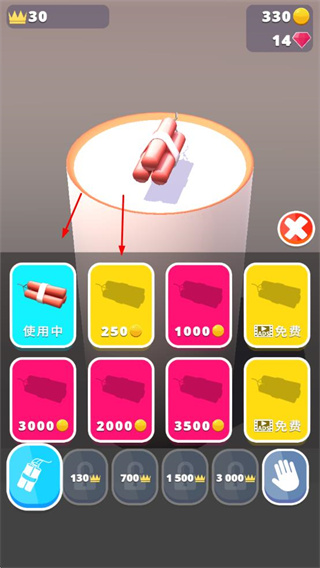 1、在道具選擇界面,可使用金幣或通過其他方式解鎖不同的爆破道具,選擇使用中的道具進(jìn)行建筑爆破。