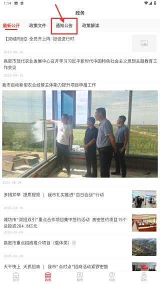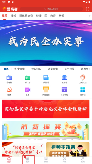 1、打開愛高密應(yīng)用,點(diǎn)擊底部政務(wù)選項(xiàng),進(jìn)入政務(wù)頁面。