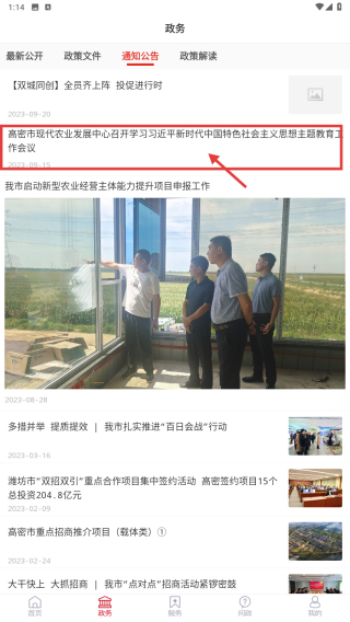 2、在政務(wù)頁面,點(diǎn)擊通知公告欄,進(jìn)入查看詳情。