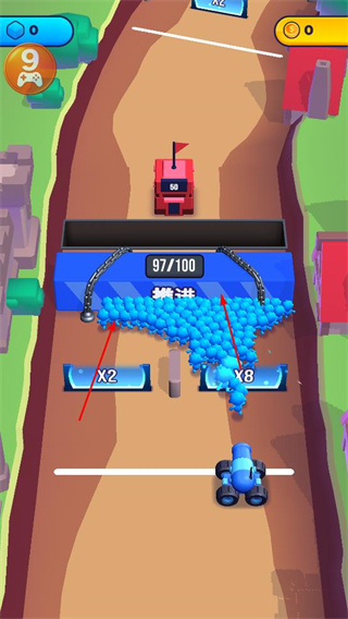 1、利用倍數(shù)功能壯大隊(duì)伍,點(diǎn)擊對(duì)應(yīng)倍數(shù)按鈕,讓藍(lán)色小人數(shù)量快速增長(zhǎng),助力推進(jìn)。