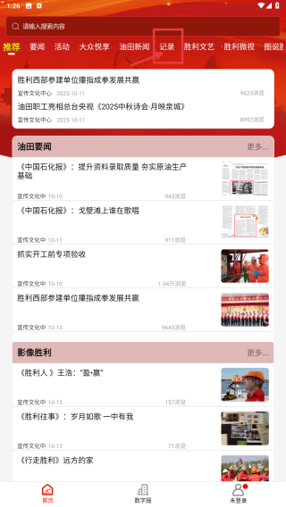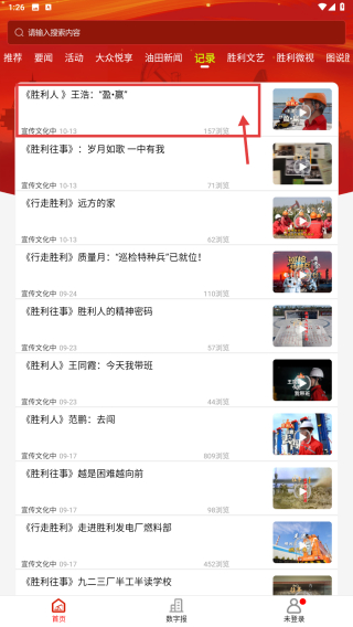 1、打開(kāi)新聞?lì)悜?yīng)用,點(diǎn)擊頂部記錄標(biāo)簽,進(jìn)入記錄板塊內(nèi)容頁(yè)面。