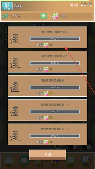 1、查看任務界面,了解任務目標,如競拍樓盤的數(shù)量達到3,明確努力方向。