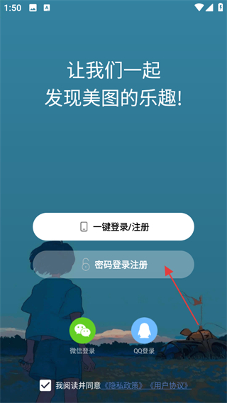 3、在登錄注冊選擇頁面,點擊密碼登錄注冊,進(jìn)入賬號密碼填寫頁面。