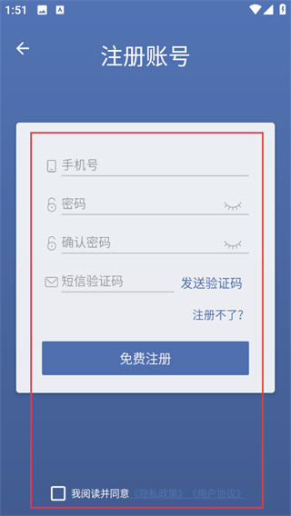 5、在注冊賬號頁面,輸入信息,勾選協(xié)議后點擊免費注冊,完成賬號注冊。
