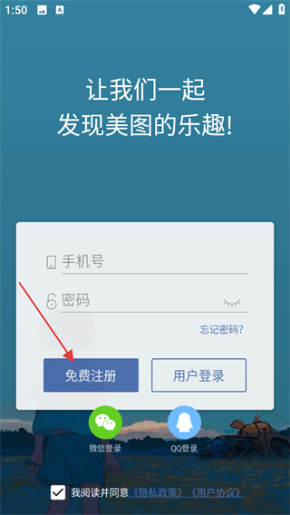 4、在賬號密碼填寫頁面,點擊免費注冊,進(jìn)入注冊賬號頁面。