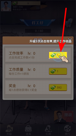2、可升級工作相關屬性,像工作效率,升級后點擊完成的工作數(shù)會增加,還有工作質(zhì)量,能提升每份工作的績效,升級需消耗對應的資源。