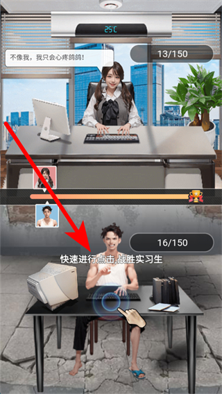 3、存在與其他角色的互動比拼,比如和實習生比拼點擊速度,要快速點擊,戰(zhàn)勝后能獲得相應獎勵,推動角色在職場中進步。