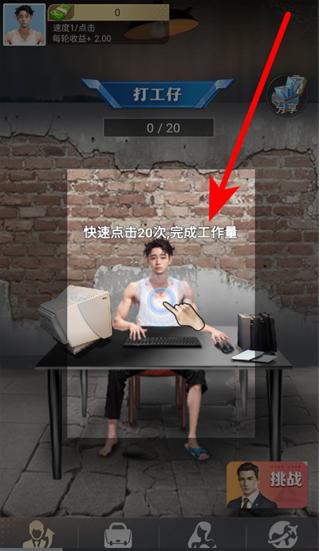 1、進入游戲后,會有工作任務提示,比如快速點擊指定次數(shù)完成工作量,此時需快速點擊屏幕對應區(qū)域,完成任務獲取收益與經(jīng)驗。