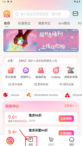 1、打開代購類應(yīng)用,點(diǎn)擊底部發(fā)現(xiàn)選項(xiàng),進(jìn)入發(fā)現(xiàn)板塊頁面。