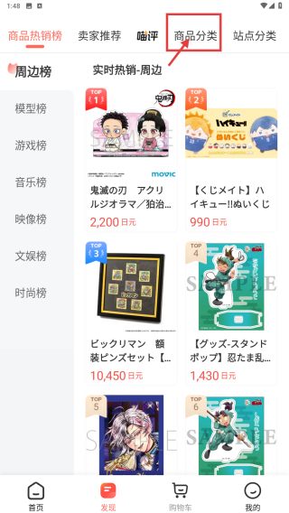 2、在發(fā)現(xiàn)板塊,點(diǎn)擊商品分類選項(xiàng),進(jìn)入商品分類界面。