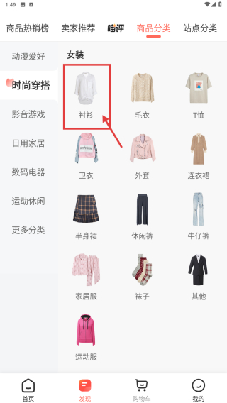 4、在時(shí)尚穿搭欄目中,選擇襯衫分類,查看對應(yīng)商品列表。