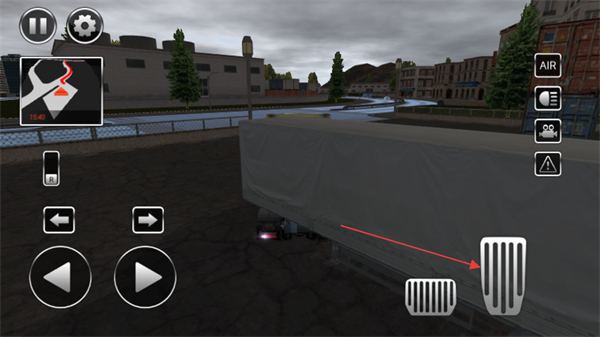 3、連接好貨箱后,點(diǎn)擊屏幕右側(cè)的油門按鈕,啟動(dòng)卡車開始行駛。