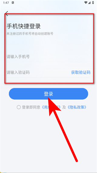 4、輸入手機號和驗證碼,勾選同意協(xié)議后,點擊登錄,完成注冊。