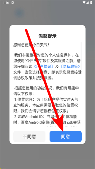 1、打開及時雨天氣預(yù)報,在彈窗中點擊同意。
