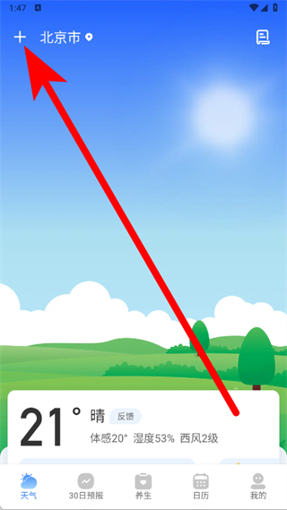 1、打開(kāi)及時(shí)雨天氣預(yù)報(bào),點(diǎn)擊左上角+。