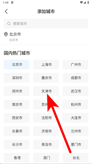3、進(jìn)入添加城市頁(yè)面,點(diǎn)擊天津市。