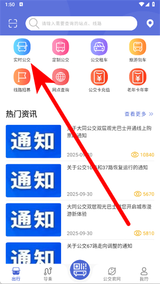 1、打開(kāi)大同公交線路查詢,點(diǎn)擊實(shí)時(shí)公交。