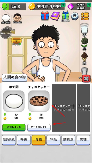 1、在食物界面,可選擇如ゆで卵、チョコクッキー等食物,點(diǎn)擊對應(yīng)按鈕選擇,為后續(xù)進(jìn)食做準(zhǔn)備。