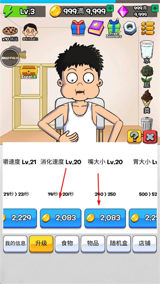 2、消耗金幣升級嚼速度、消化速度、嘴大小等屬性,提升角色進(jìn)食相關(guān)能力。