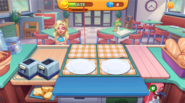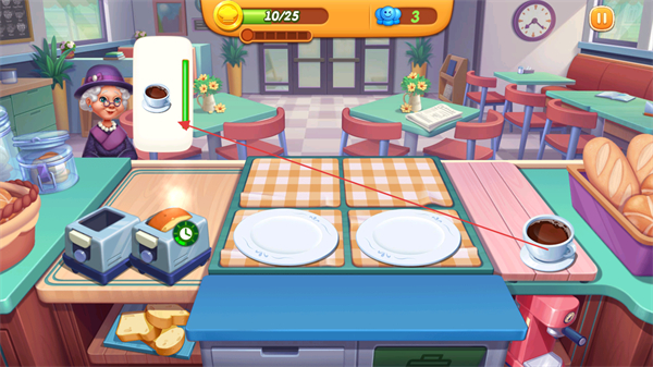 1、進(jìn)入游戲,查看屏幕上方金幣目標(biāo)10/25和顧客情緒值如4,留意顧客需求。