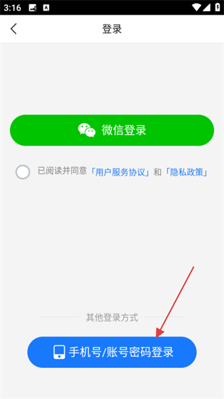 3、在登錄選擇頁(yè)面,點(diǎn)擊手機(jī)號(hào)賬號(hào)密碼登錄,進(jìn)入手機(jī)號(hào)登錄頁(yè)面。