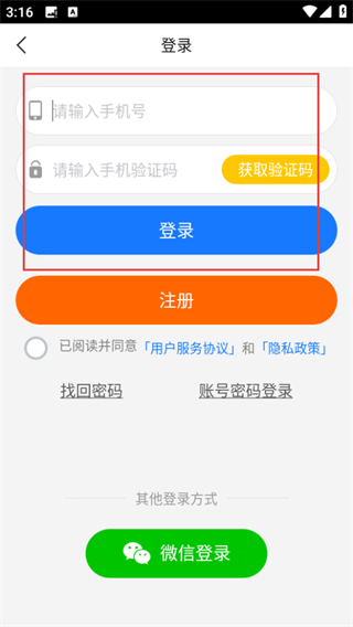 4、在手機(jī)號(hào)登錄頁(yè)面,輸入信息勾選協(xié)議后,點(diǎn)擊登錄,完成登錄操作。