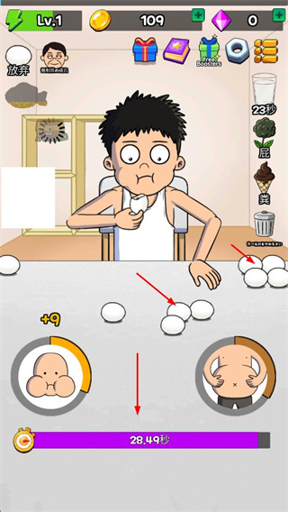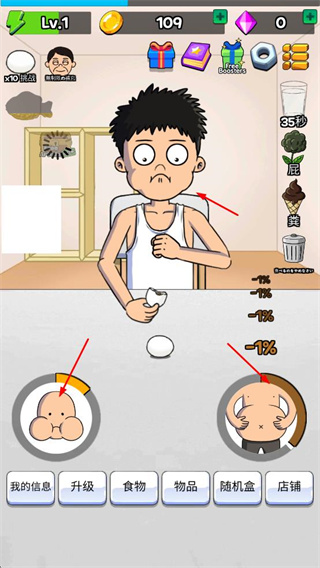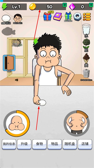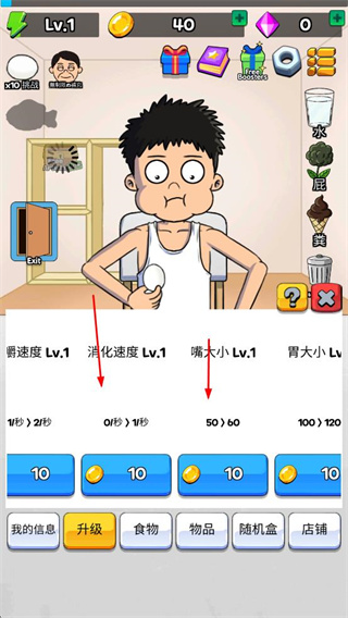 2、消耗金幣升級(jí)嚼速度、消化速度、嘴大小、胃大小等屬性,提升角色進(jìn)食相關(guān)能力。
