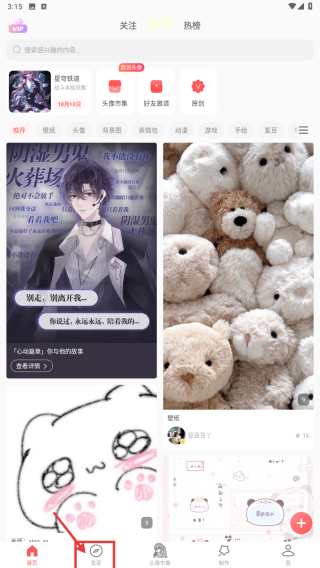 1、打開(kāi)壁紙類應(yīng)用,點(diǎn)擊底部發(fā)現(xiàn)選項(xiàng)板塊,進(jìn)入發(fā)現(xiàn)頁(yè)面。