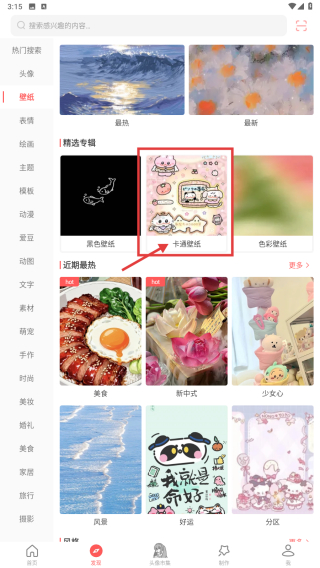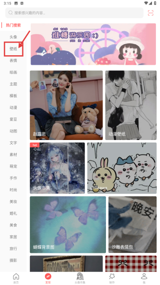 2、在發(fā)現(xiàn)板塊,點(diǎn)擊壁紙分類標(biāo)簽,進(jìn)入壁紙頻道。