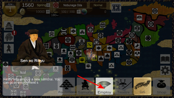 1、進入雇傭界面,點擊Employ按鈕,進入武士的雇傭界面,開啟招募武士的流程。