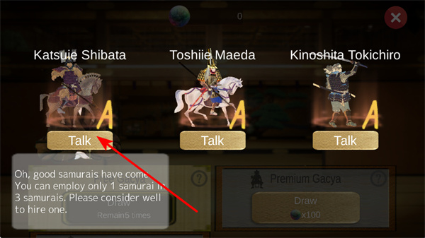 3、選擇雇傭武士,在抽取到的武士中,點Talk按鈕,選擇合適的武士進行雇傭,為上陣儲備人員。