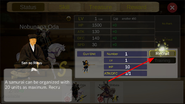 4、招募部隊單位,進入武士狀態(tài)界面,點擊Recruit按鈕,招募部隊單位,每個武士可組織最多20個單位。