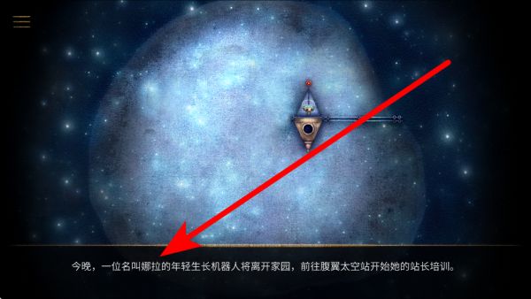 1、進(jìn)入游戲后,會有劇情引導(dǎo),了解機(jī)器人娜拉將離開家園,前往腹翼太空站培訓(xùn)的背景。